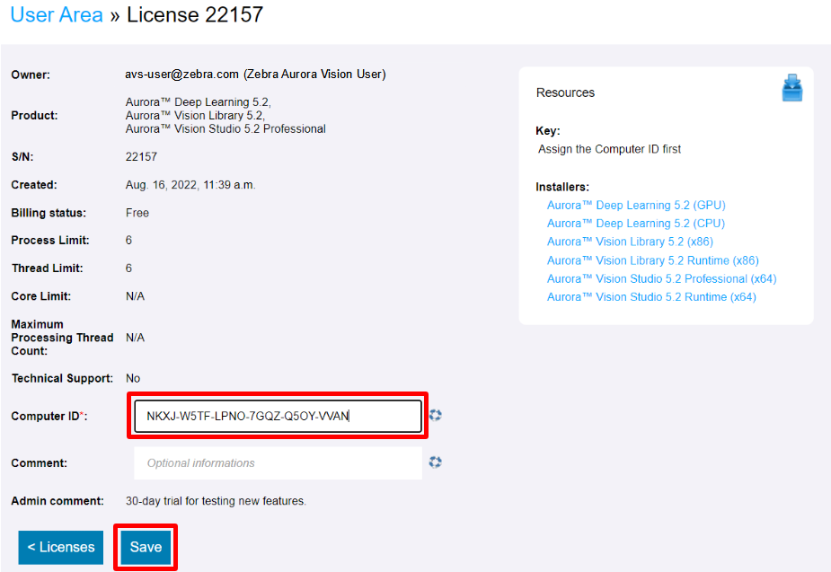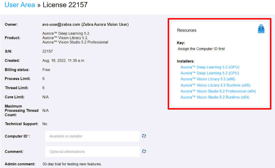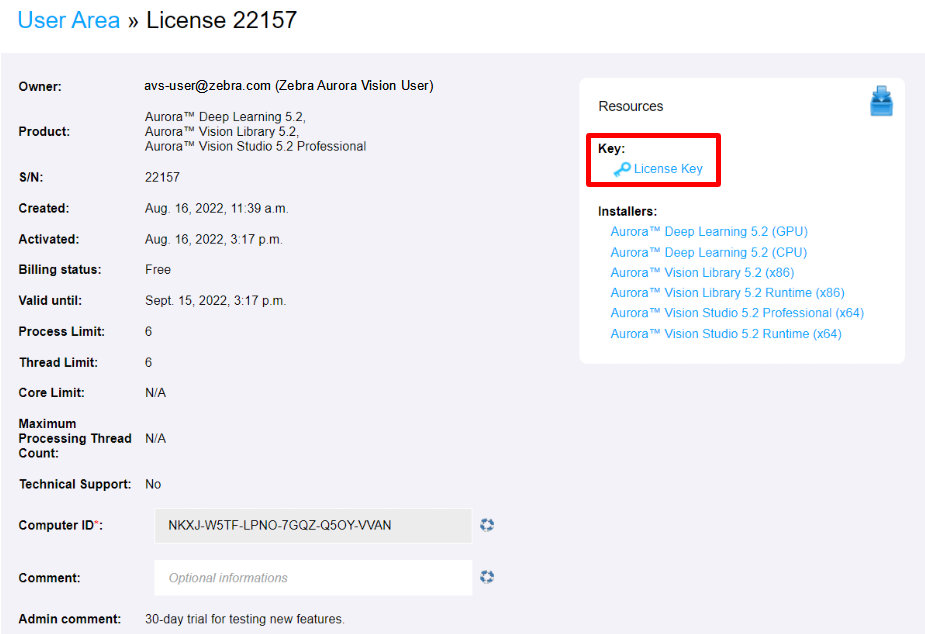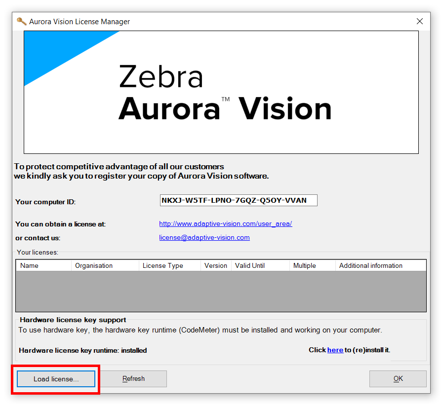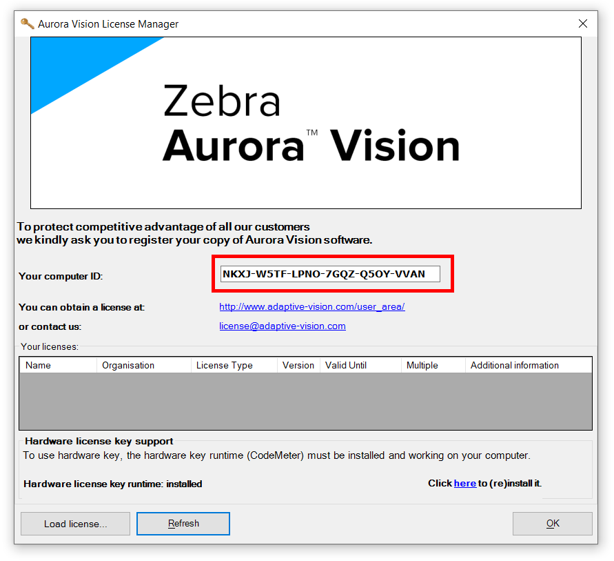 Die Dateilizenzen hängen von Computer-ID ab. Folgend finden Sie eine schriftweise Anleitung zum Umgang mit dieser Art von Lizenz. Bitte beachten Sie, dass die folgende Beschreibung auch für das Zebra Aurora Deep Learning gilt, falls es separat gekauft wurde oder Sie eine separate Lizenz erhalten haben. Weitere Informationen finden Sie im unteren Teil dieser Internetseite.
