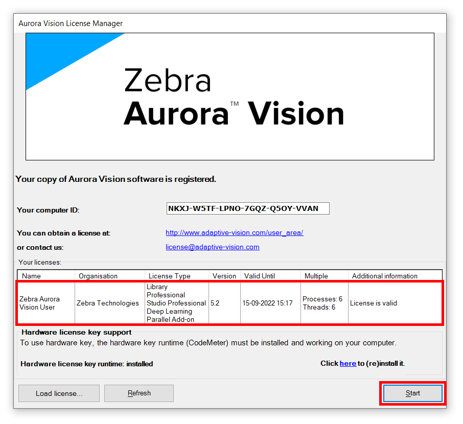 Nachdem der Schlüssel akzeptiert wurde, klicken Sie auf die Start-Schaltfläche, um Zebra Aurora Vision Studio zu starten.