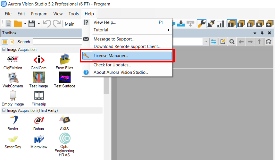 Öffnen Sie den Lizenzmanager, der in Zebra Aurora Vision Studio im Menü "Hilfe" verfügbar ist, und kopieren Sie deine Computer-ID.